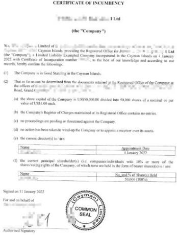 - “Sample certification of passport or ID card_Identity certification Cayman certification format”: a copy of the passport / identity card of each director, shareholder, ultimate beneficiary and a copy of the proof of address certified by a notary public / lawyer / accountant.